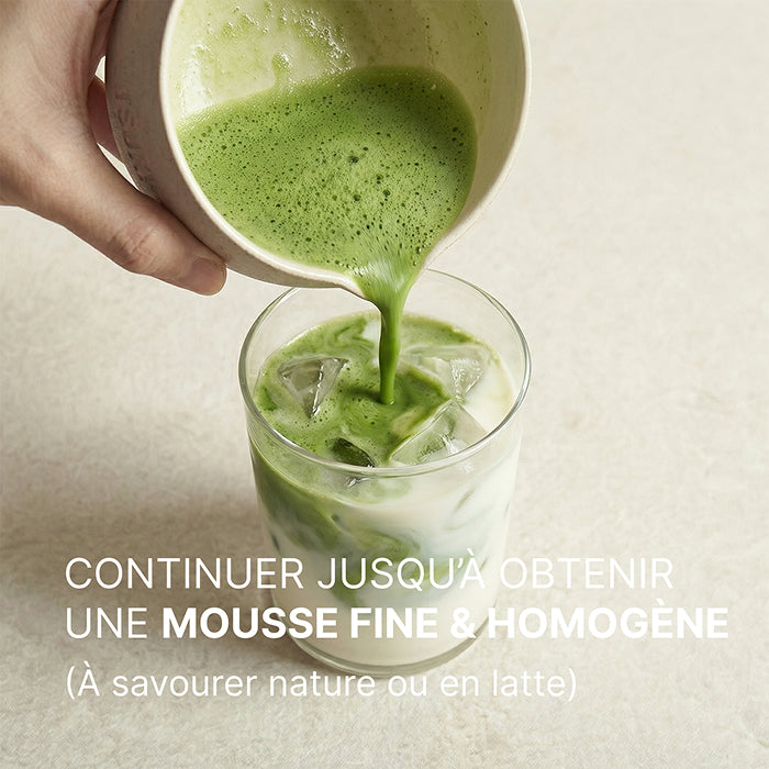C’est un thé vert en poudre que l’on fouette et non que l’on infuse, il offre des bienfaits puissants car on consomme la feuille entière, et il peut aussi être utilisé comme ingrédient en cuisine, dans des boissons comme des recettes.