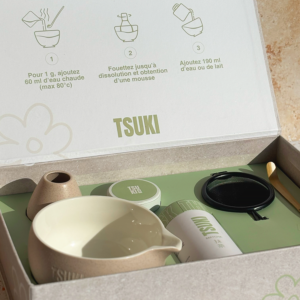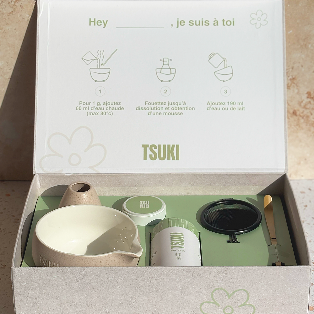 Le Coffret Rituel Matcha TSUKI rassemble tous les essentiels pour préparer et savourer ton matcha à la maison.
